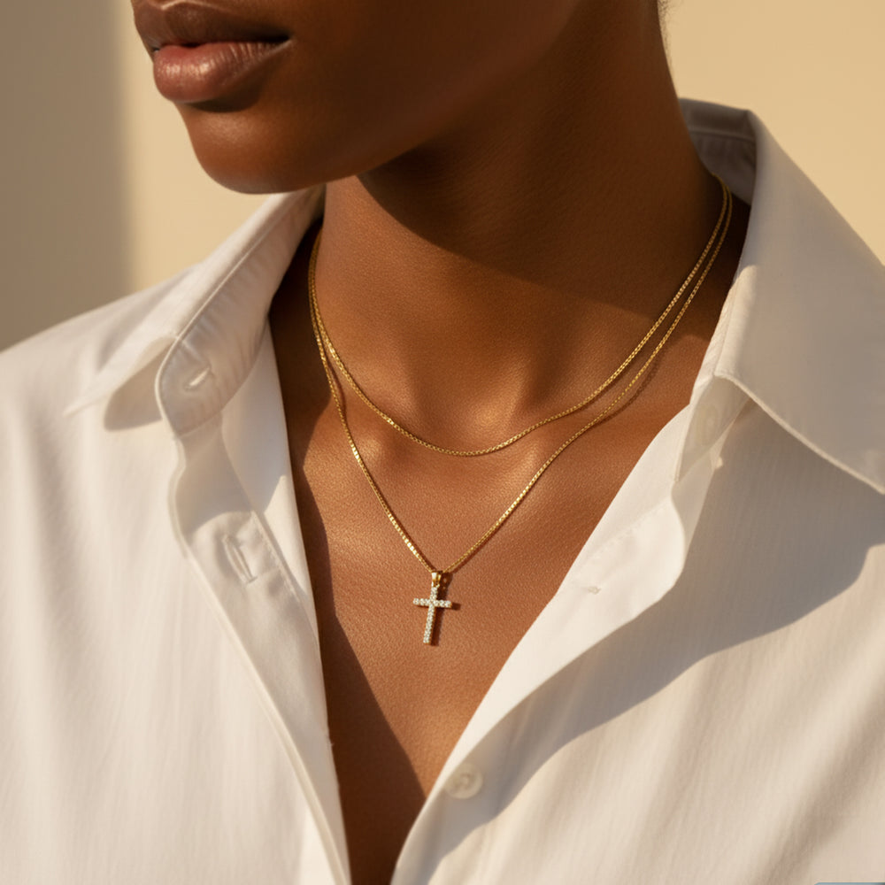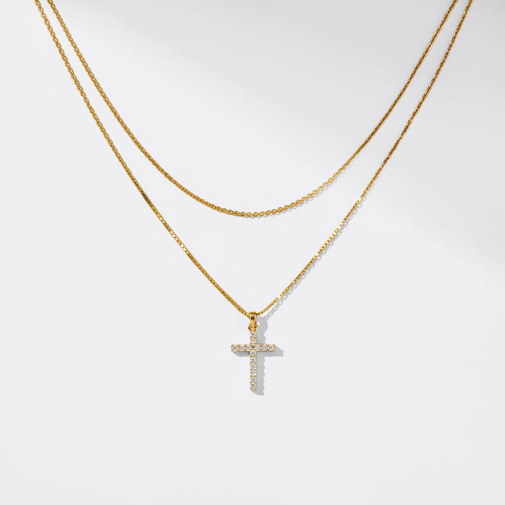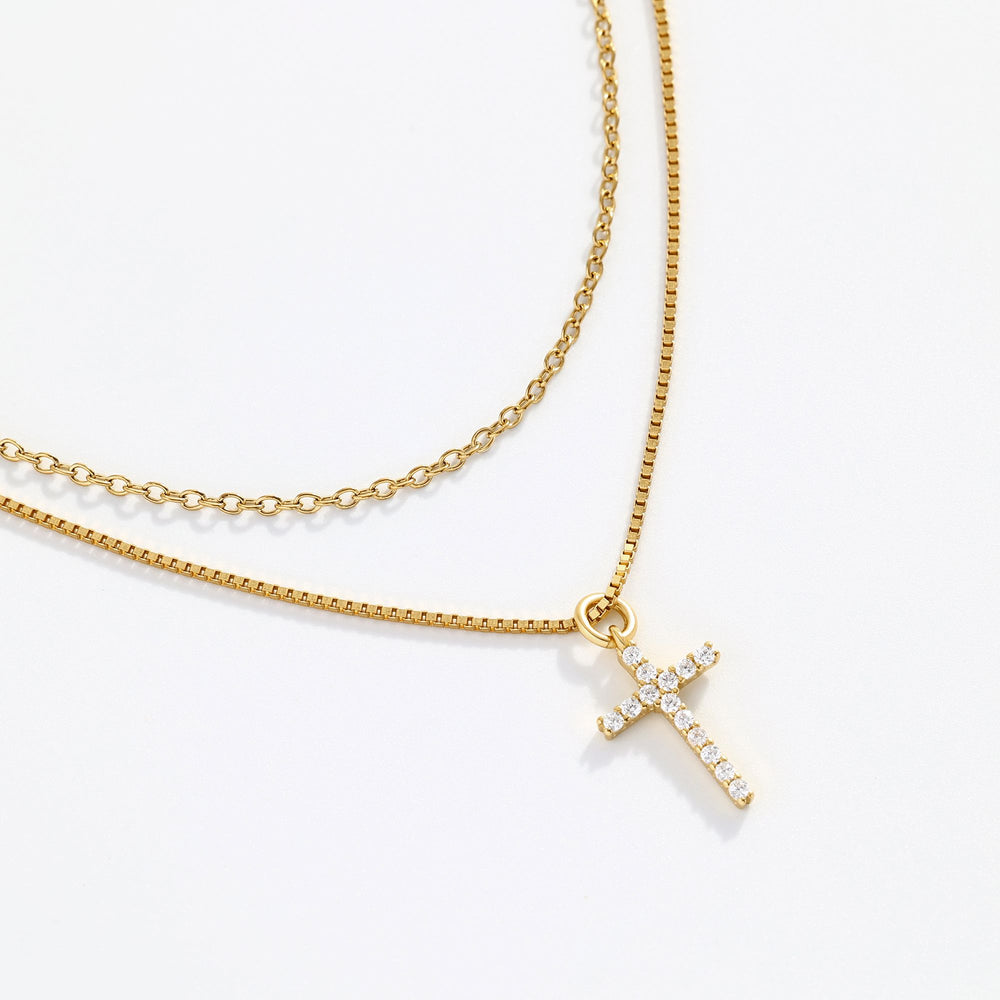 Elevate your layered look with this delicate stacking set featuring a dainty cable necklace paired with a sparkling pavé cross chain. The minimalist cable chain adds a subtle shimmer, while the pavé-accented cross brings a touch of brilliance and meaning.