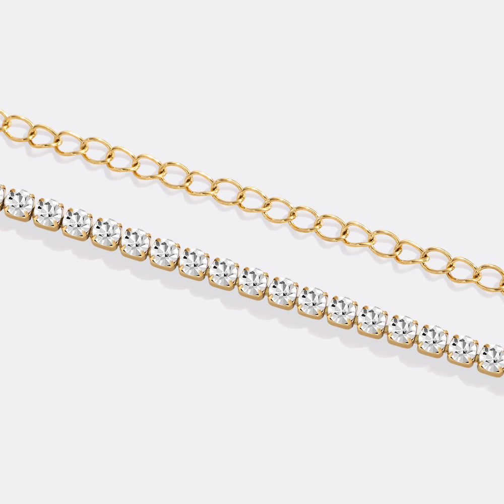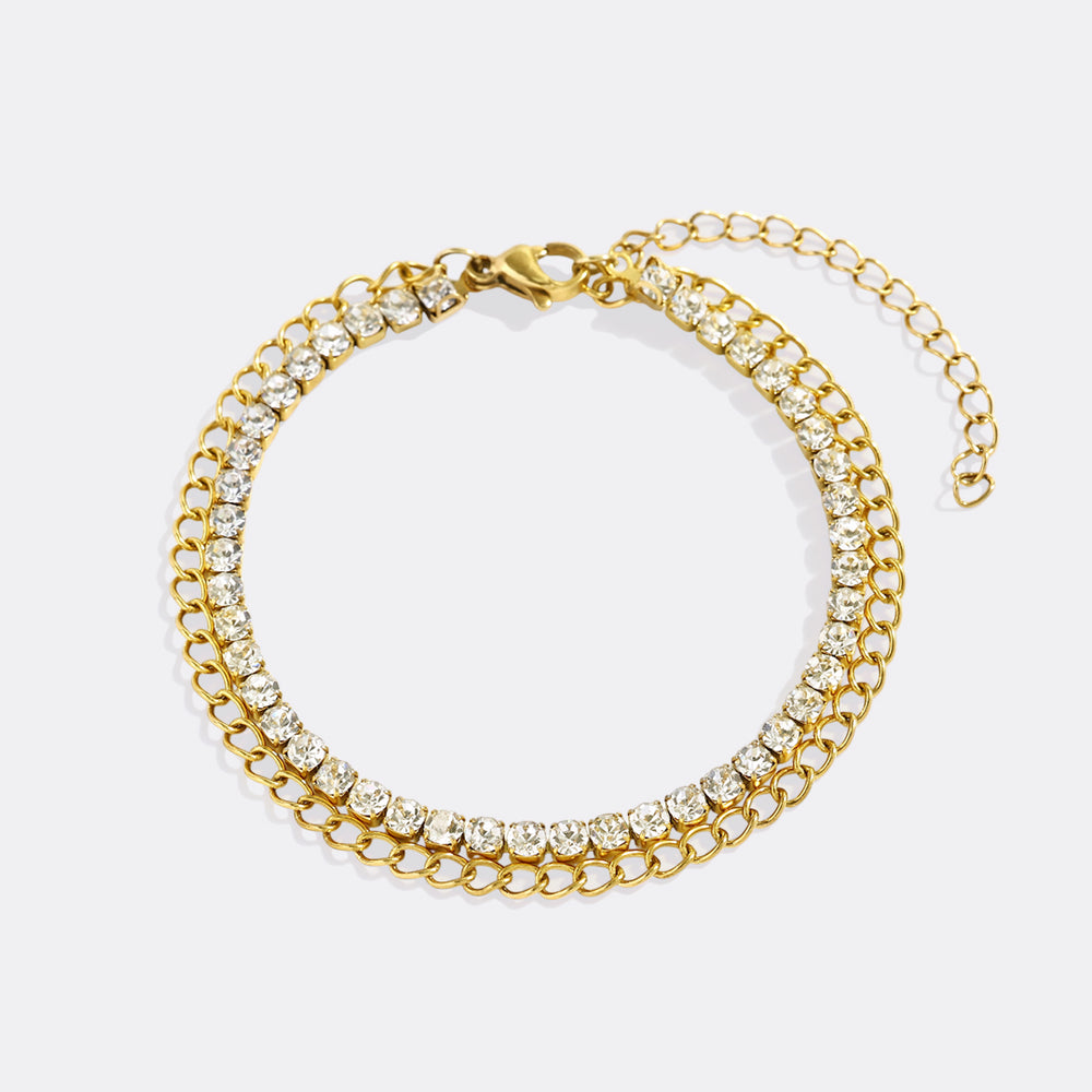 A double-row bracelet that has the best of two worlds, as a shining tennis bracelet and a classic gold cable chain are linked together