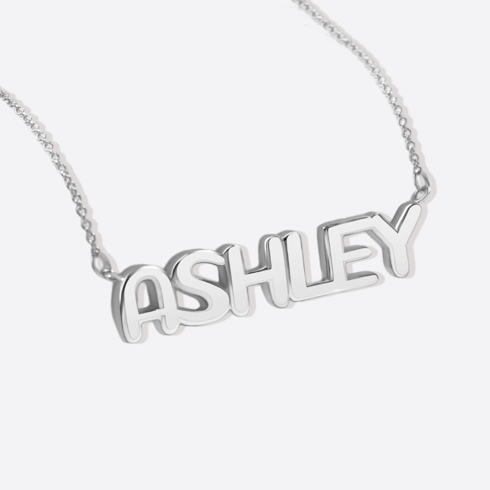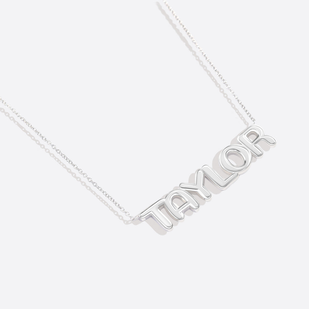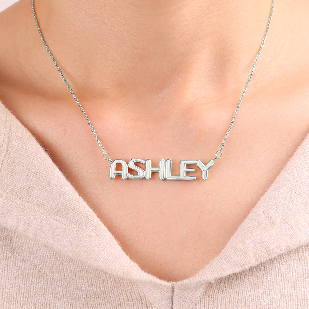 This playful piece features your name crafted in a fun, balloon letter style, adding a whimsical touch to your jewelry collection.