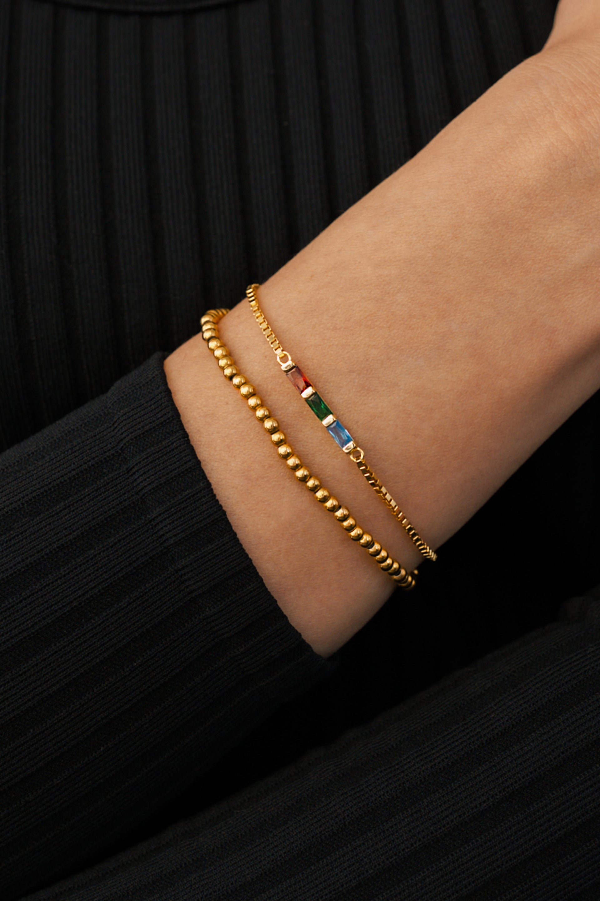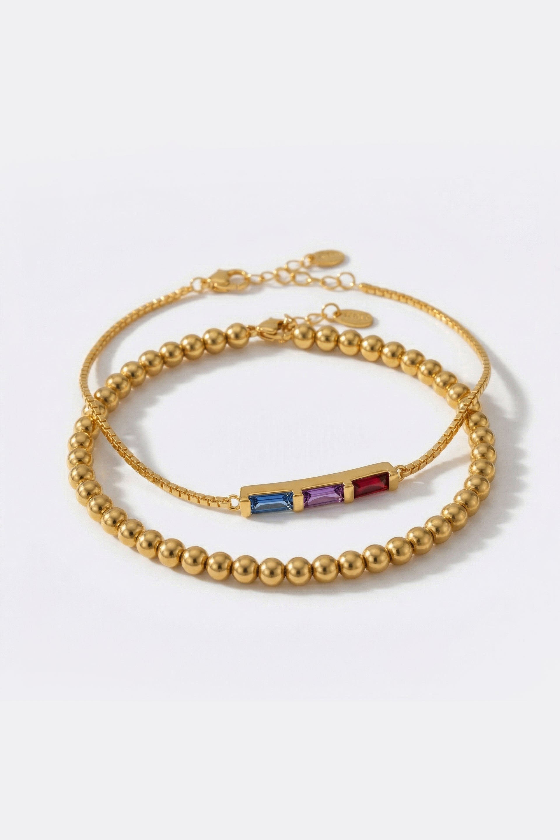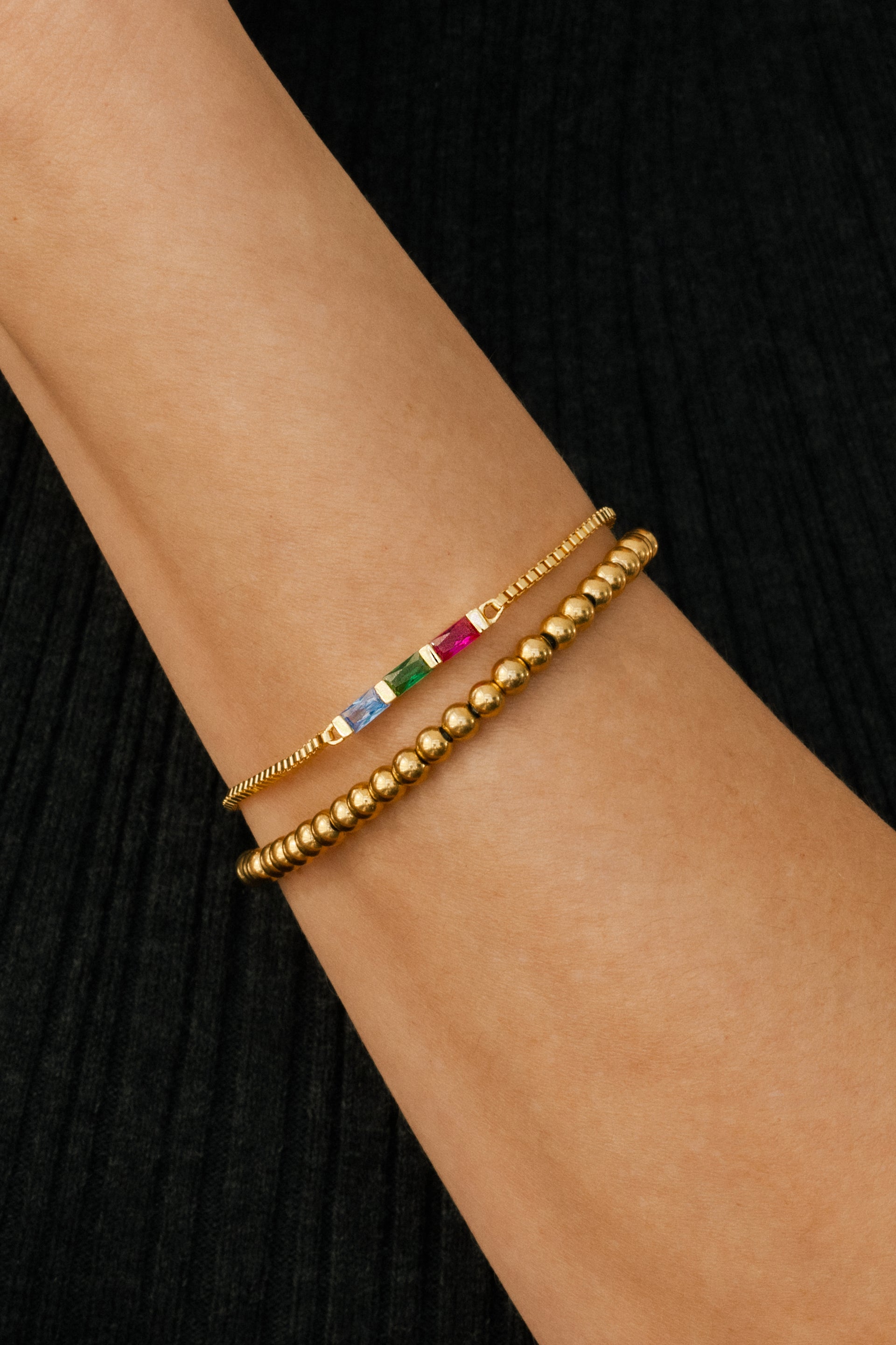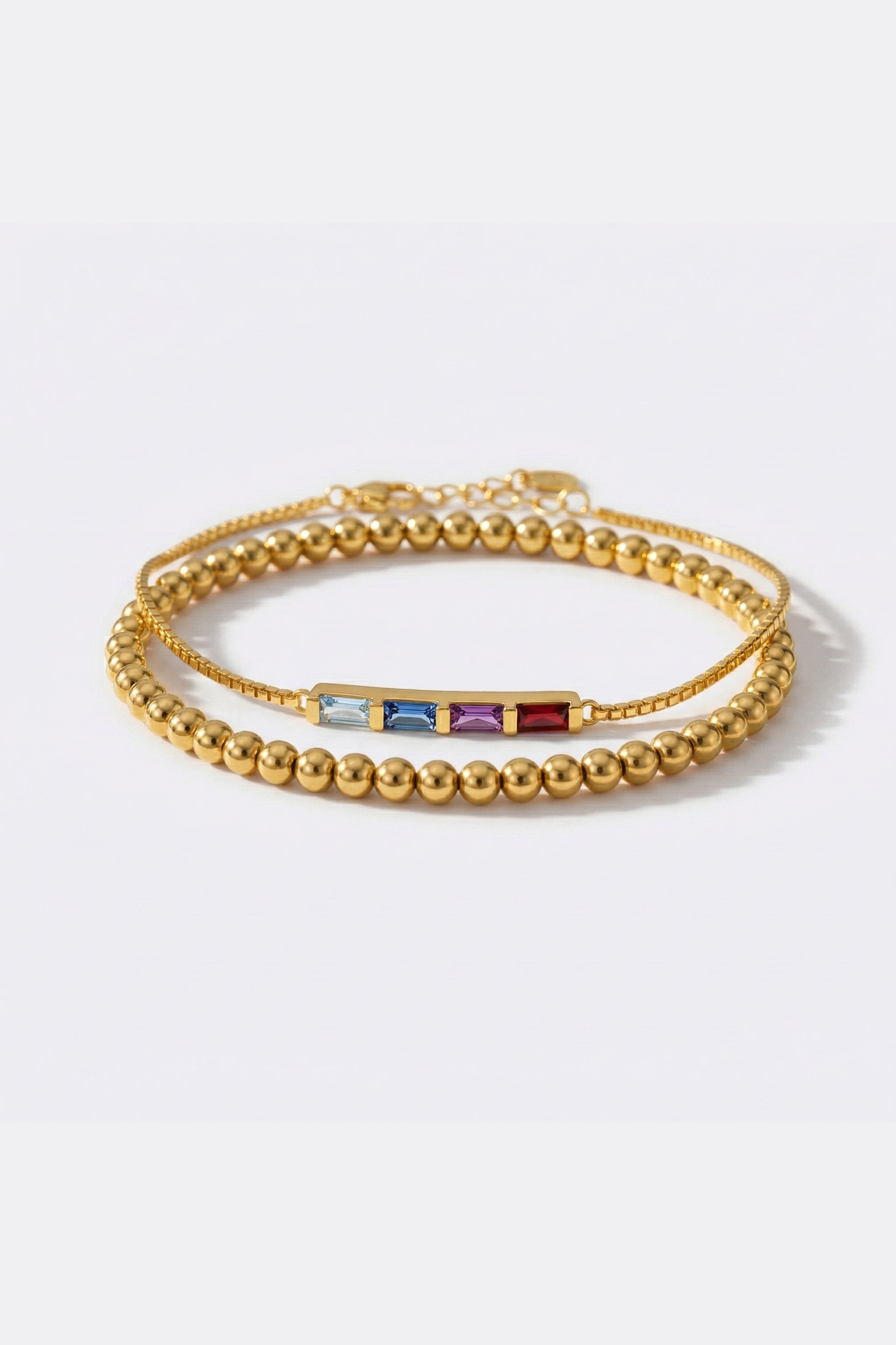 Dainty Baguette Birthstone Bracelet and Beaded Stacking Bracelet Set