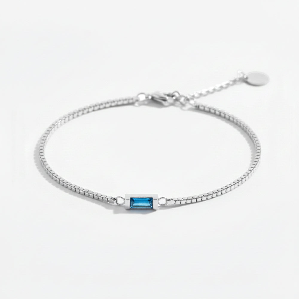 This dainty birthstone bracelet adds just a whisper of sparkle with its petite baguette gemstone charm on a fine chain. Light, subtle, and heartfelt—easy to layer with other pieces or wear solo for a quietly beautiful statement.