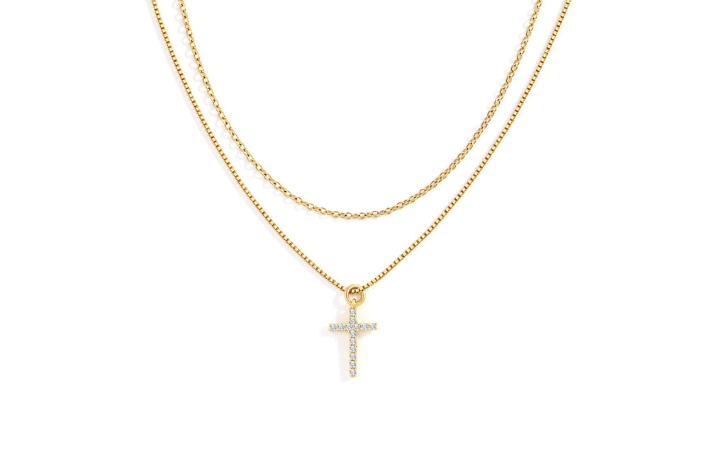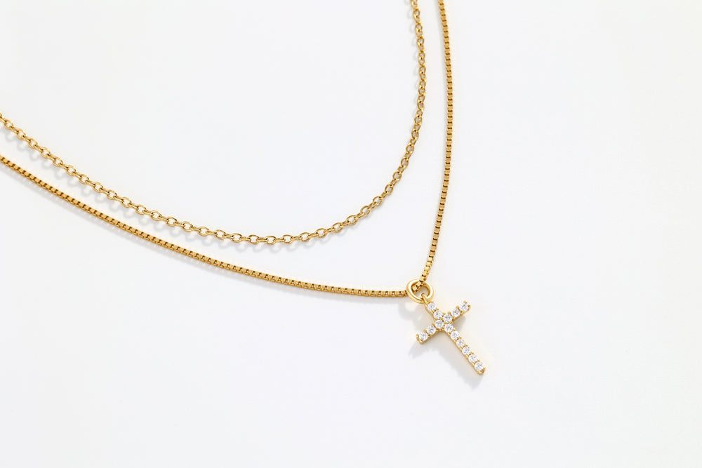 Elevate your layered look with this delicate stacking set featuring a dainty cable necklace paired with a sparkling pavé cross chain. The minimalist cable chain adds a subtle shimmer, while the pavé-accented cross brings a touch of brilliance and meaning.