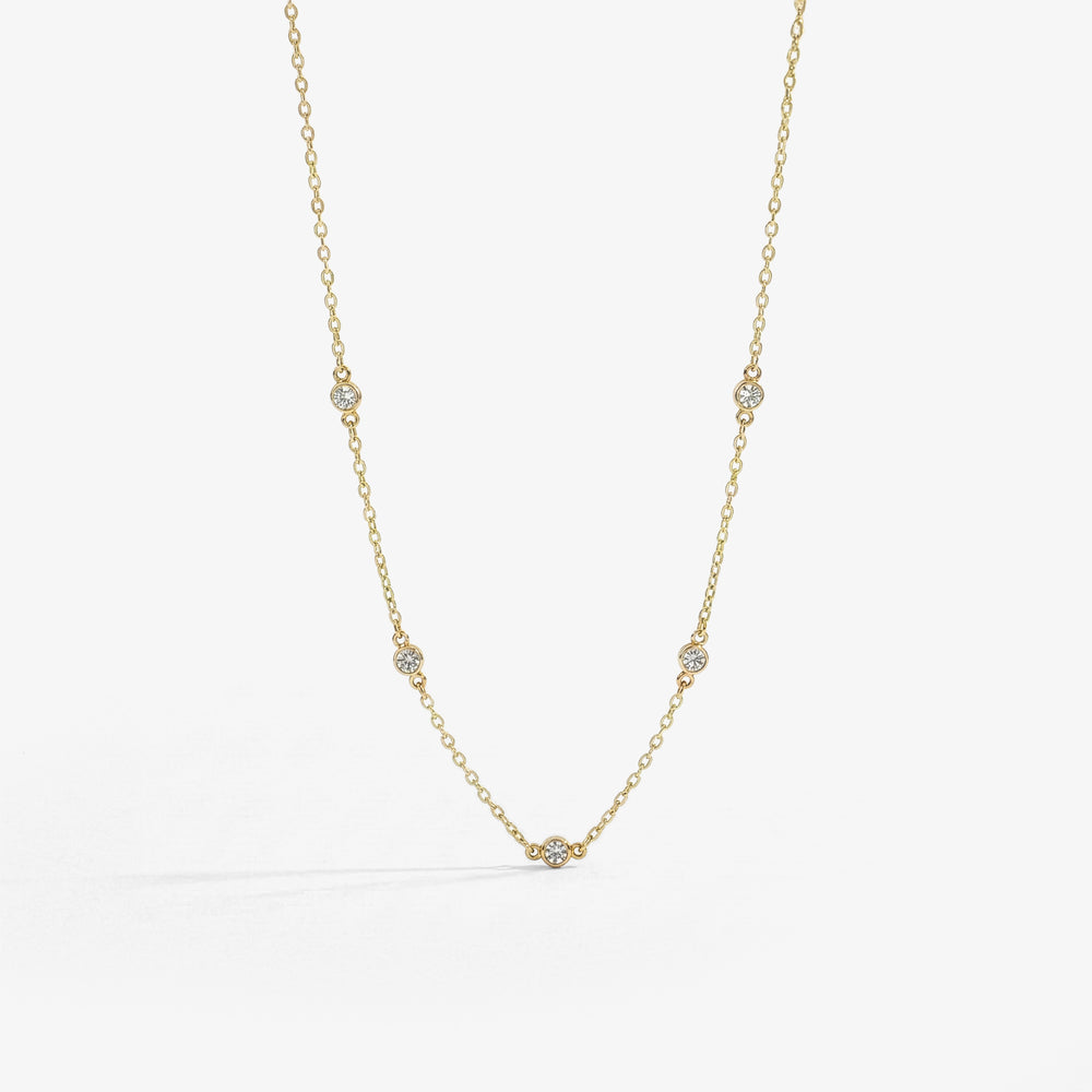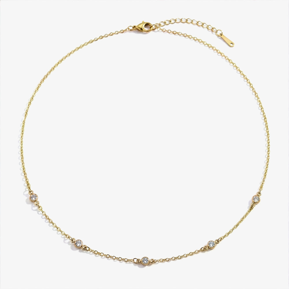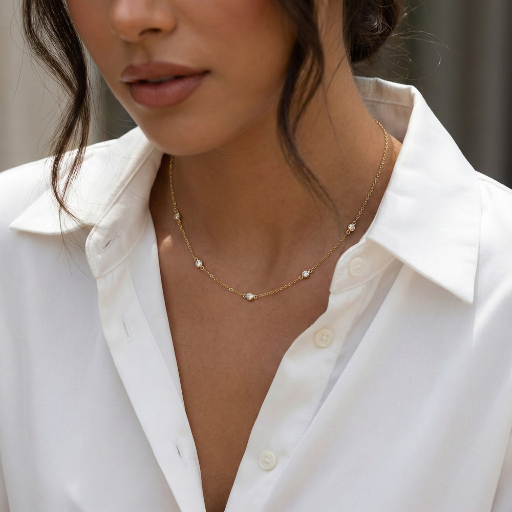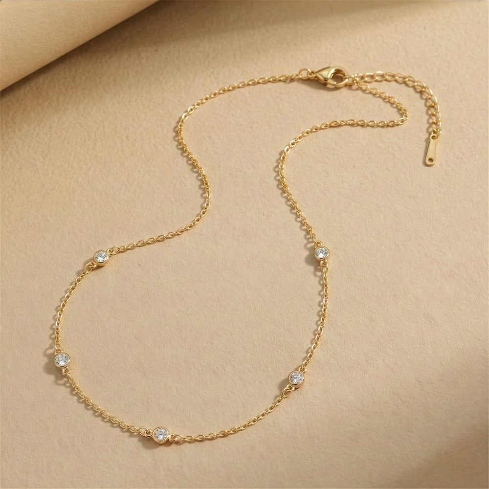 A delicate and elegant piece designed for effortless, everyday wear. Featuring a series of small, sparkling clear stones spaced evenly along a fine chain, this necklace offers a subtle yet eye-catching shimmer. Its minimalist design makes it perfect for layering or wearing on its own, adding a timeless touch of sophistication to any look.