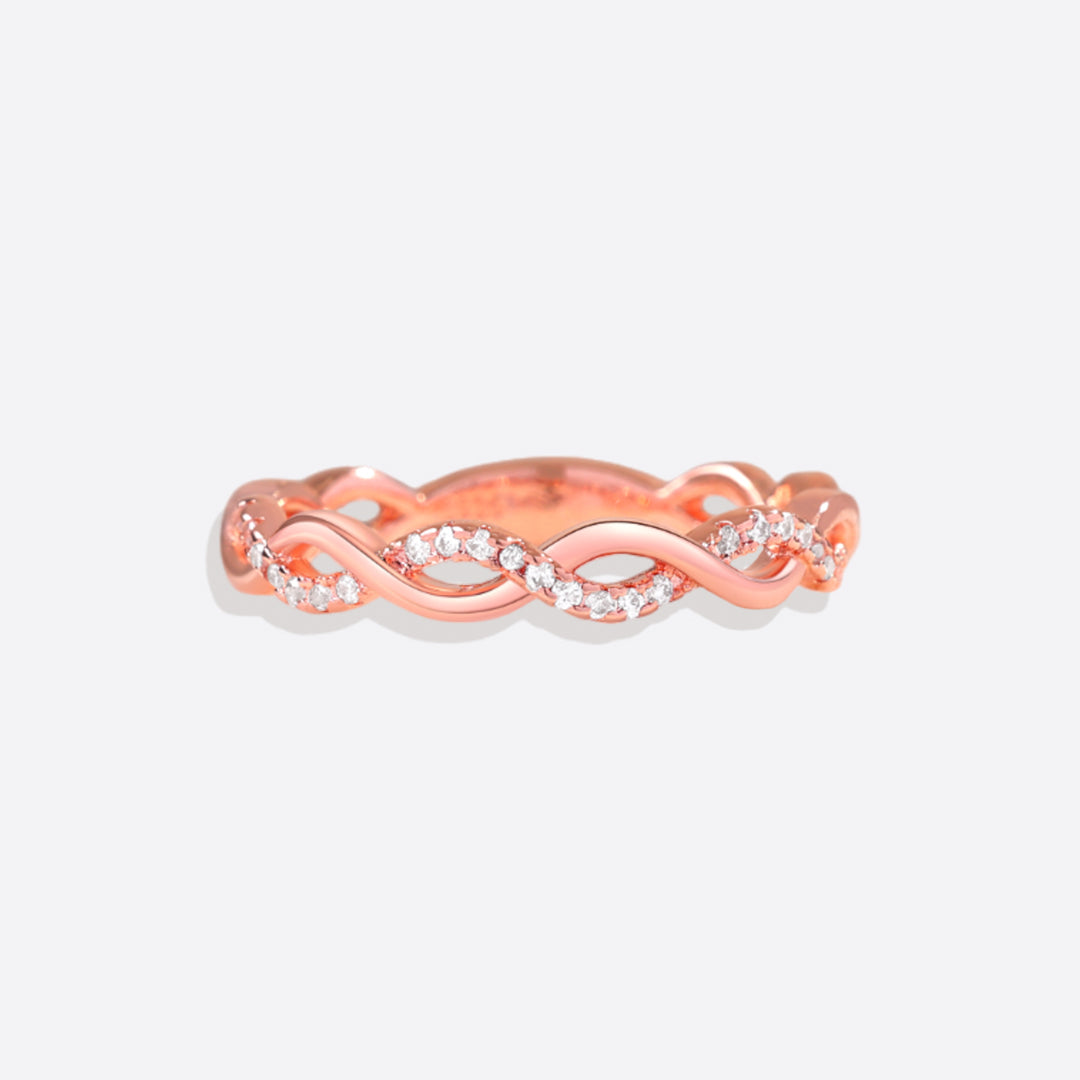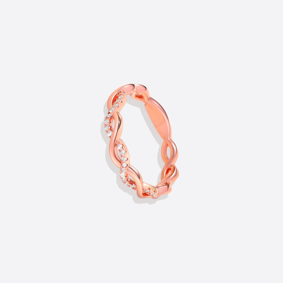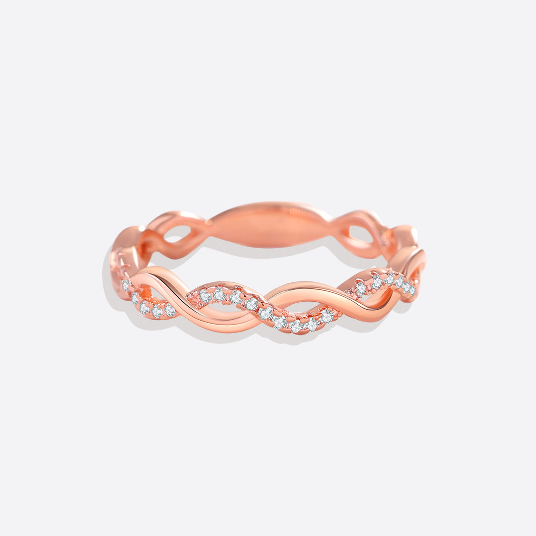 This exquisite piece features a delicate twist design, adorned with sparkling pave-set simulated diamonds that catch the light beautifully. Perfect for wearing alone for a subtle shimmer or stacking with other rings for a bold statement. Ideal for everyday wear, this ring combines sophistication with versatility.