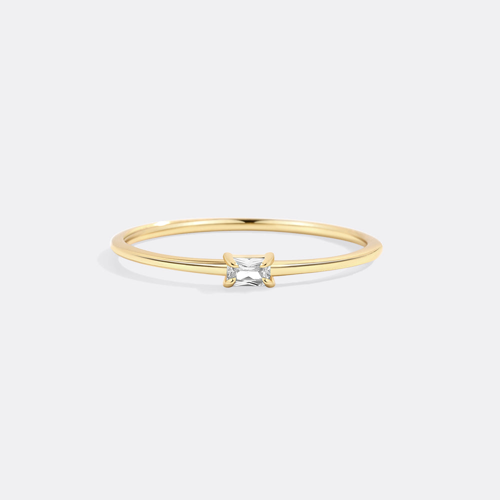 An elegant and simple baguette birthstone is prong-set in a simple band, which is meant to be worn alone or stacked well.