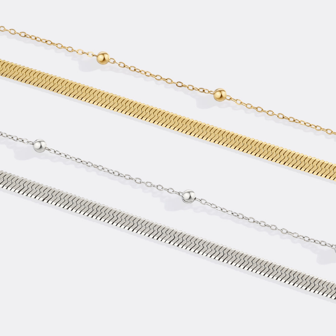 A herringbone bracelet and a lightweight satellite bracelet are linked together to create the perfect stackable bracelet.