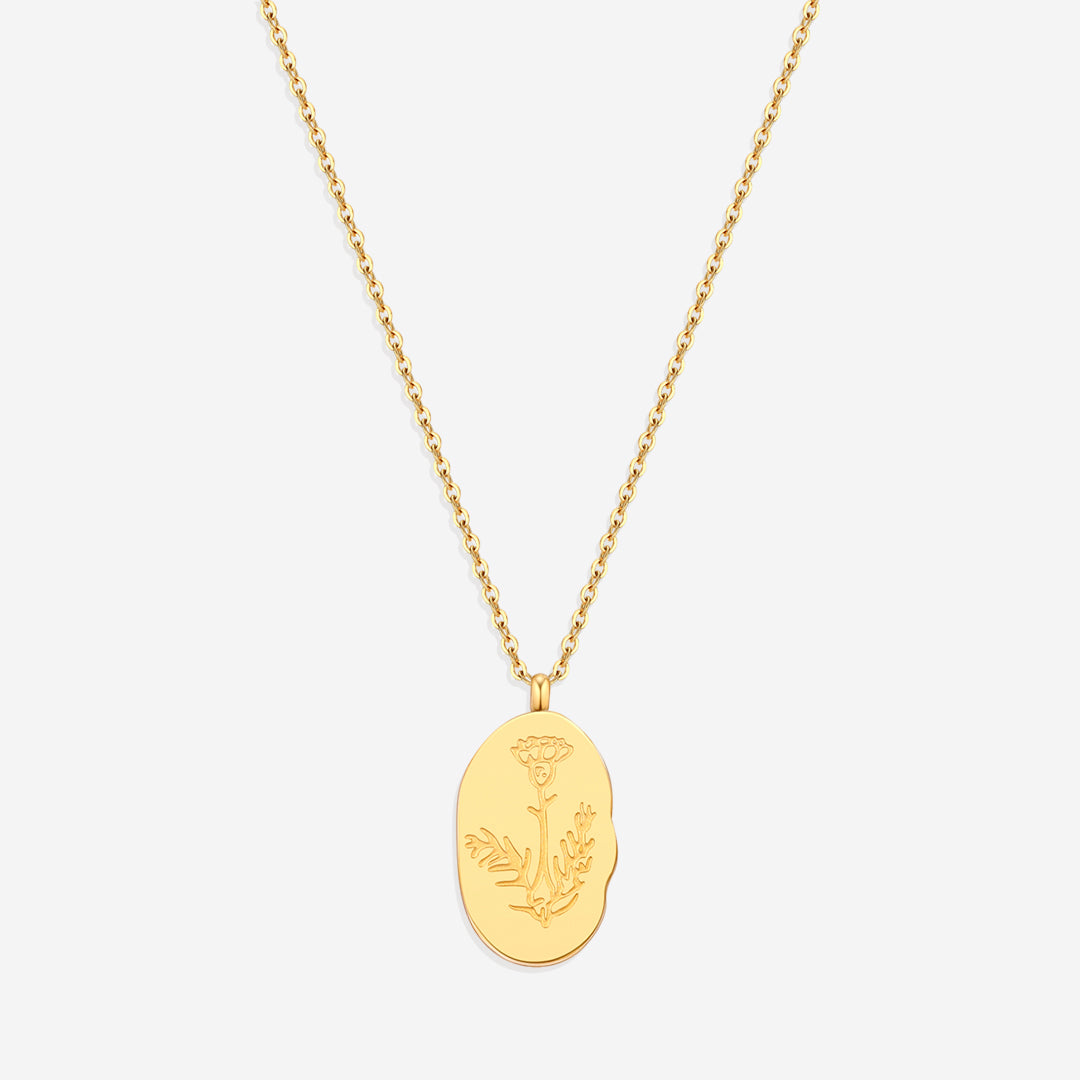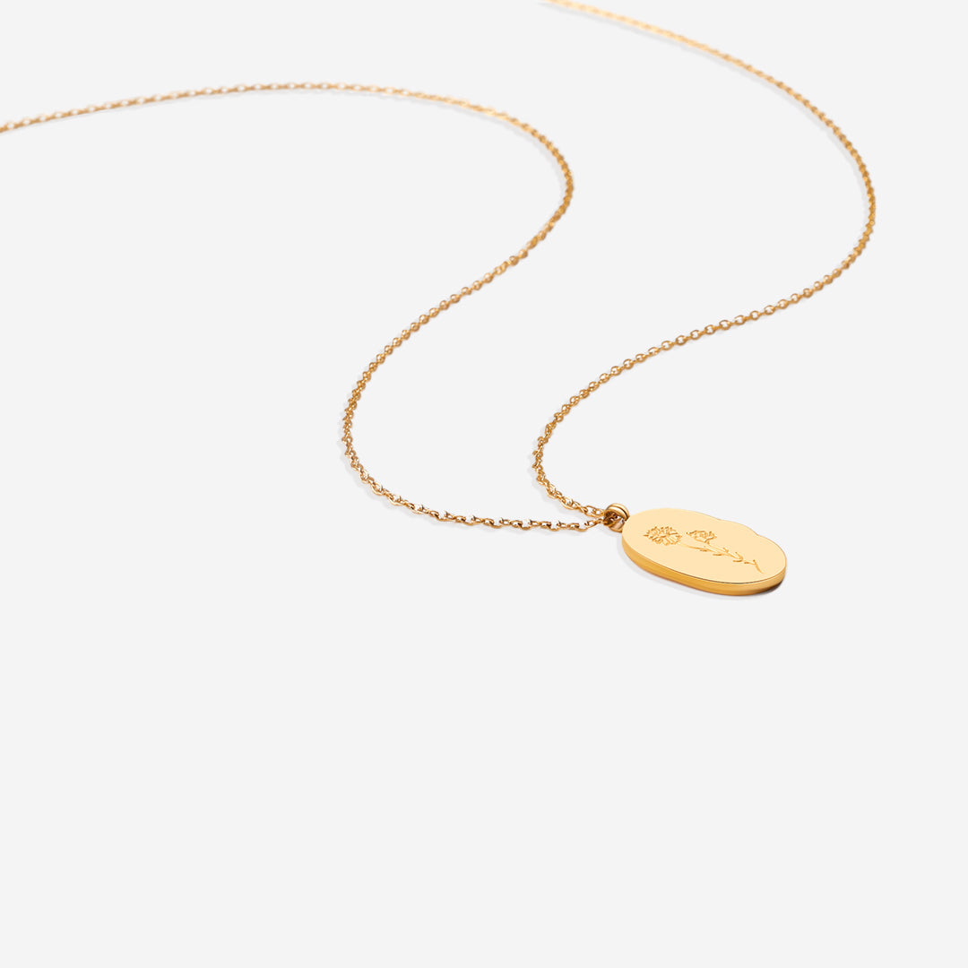 This birth flower pendant necklace is the perfect gift for her. The beautiful oval pendant is stamped with a birth flower, and is suspended from a delicate chain. The piece is dainty and subtle, making it a great accessory for any outfit. Show her how much you care with this special birth flower pendant necklace.