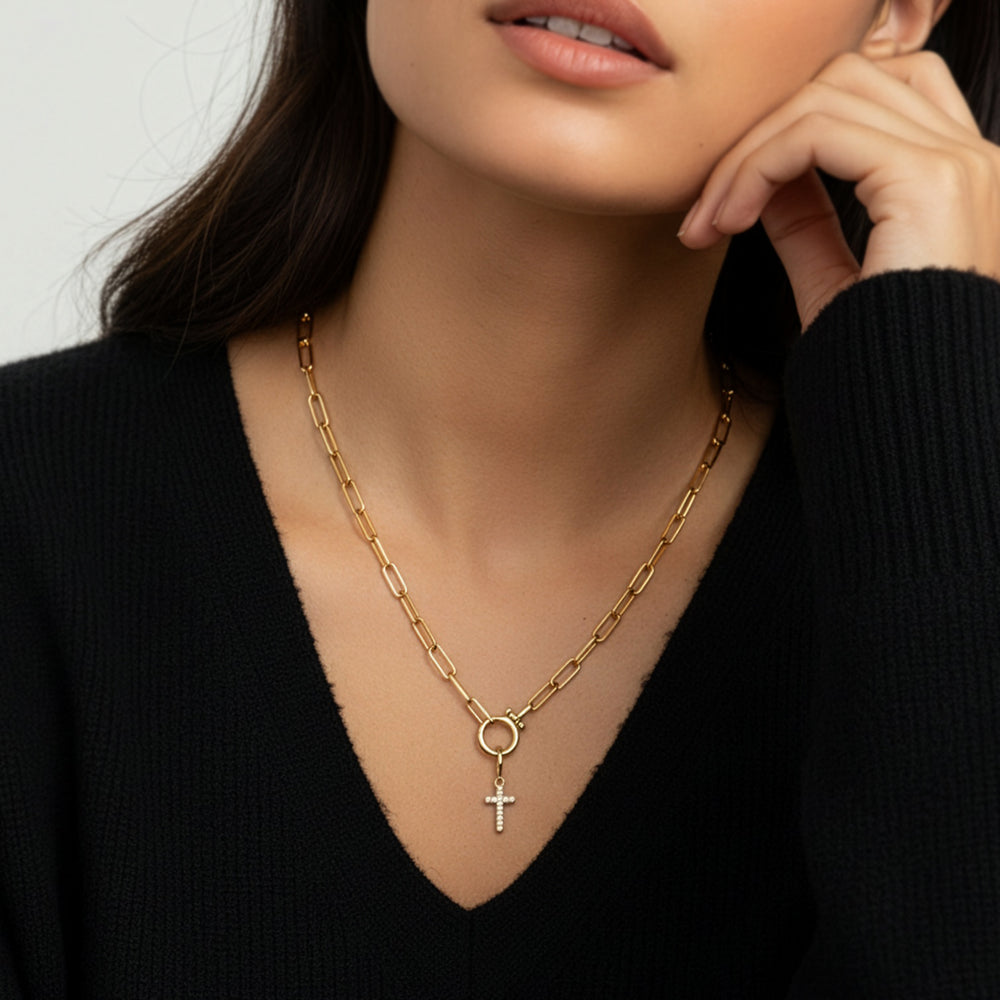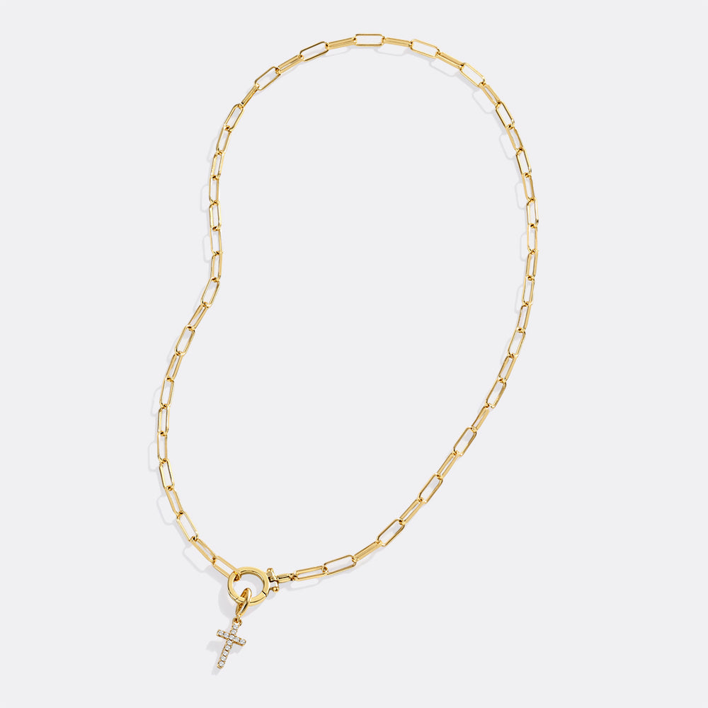 A light and airy paperclip cross necklace that balances bold shape and subtle meaning. The elongated chain links cradle a pavé cross charm that glimmers just enough to feel special without shouting. This necklace is 18" in length.