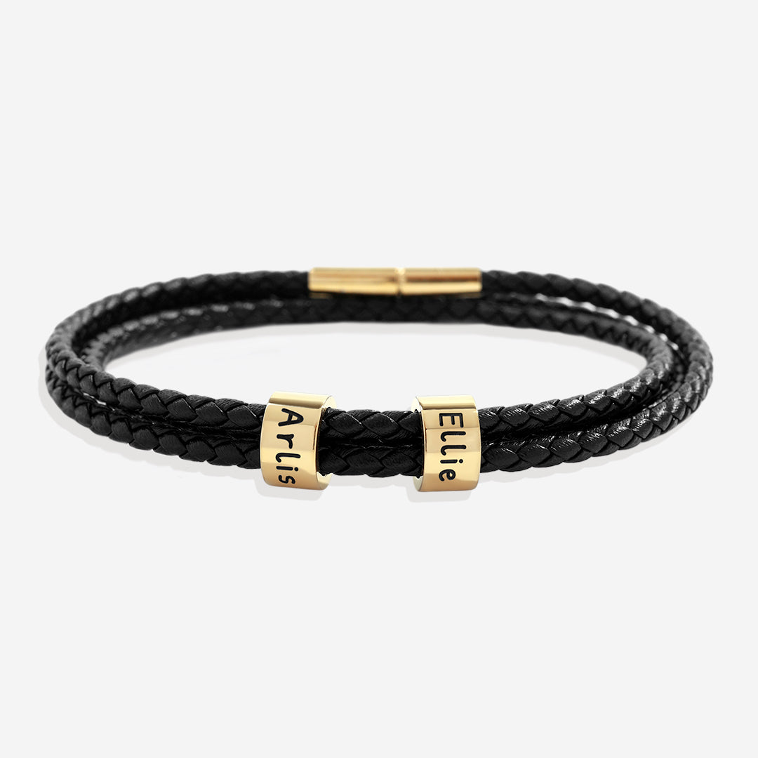 This handsome personalized bracelet features a sturdy braided leather band fastened with a solid magnetic clasp. The perfect jewelry for dad, customize it with up to 7 beads - all the children's names or any other text you like. Customize one just the way you like!