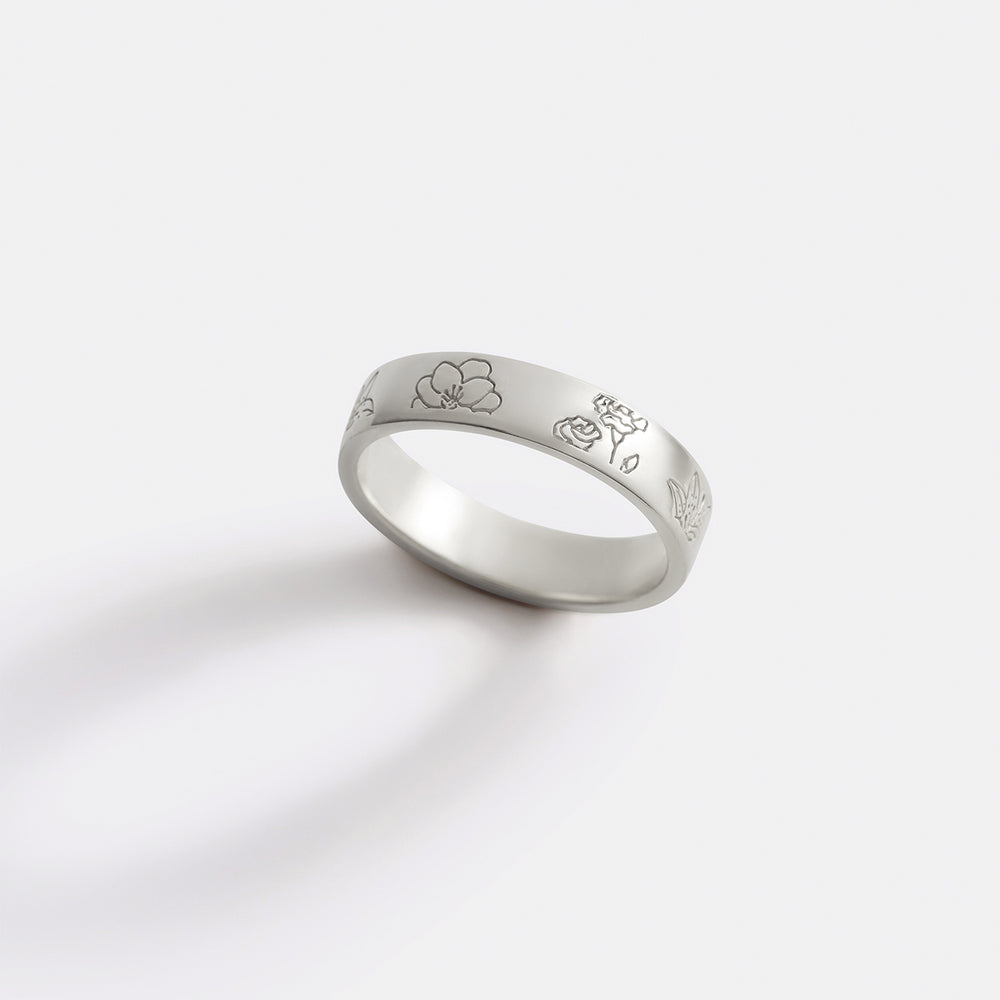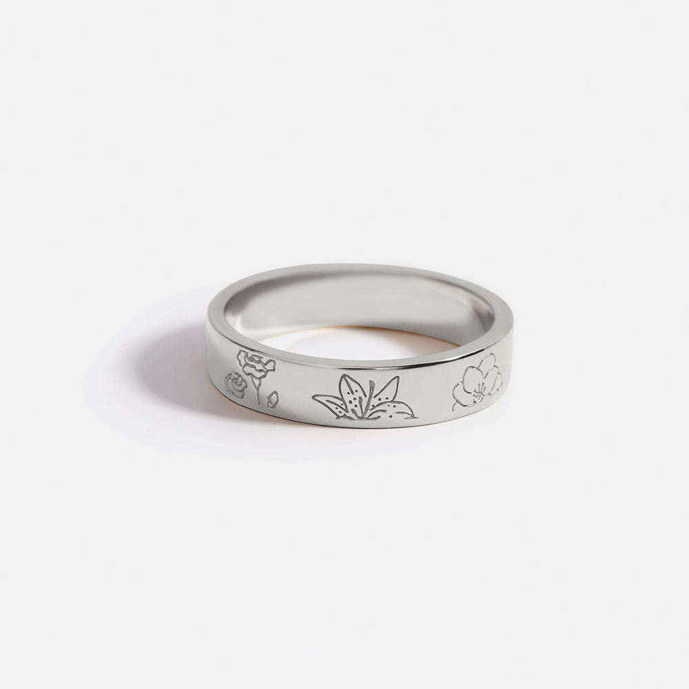 The Personalized Stamped Flower Band is a delightful addition to any jewelry collection. This elegant ring features a series of your choice of stamped flowers around the band, perfect for those who appreciate a blend of floral beauty and personal significance.