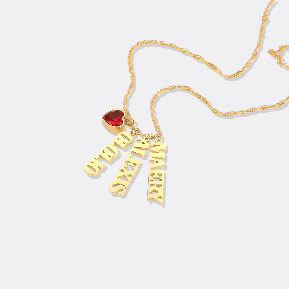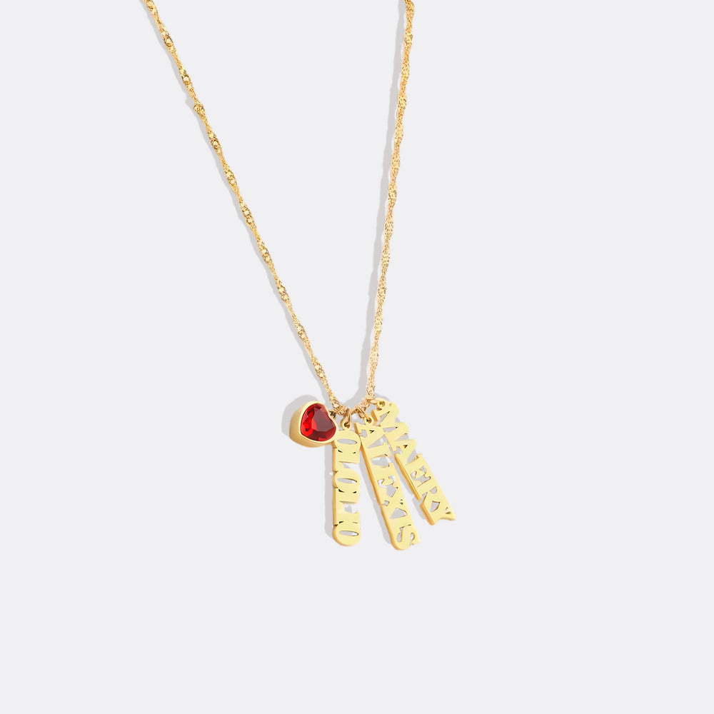 This exquisite necklace features a gracefully twisted Singapore chain, known for its sparkling appearance and durable design. Your name or a special word is artfully crafted and suspended from the chain, accompanied by heart-shaped birthstones that add a colorful, personal touch.