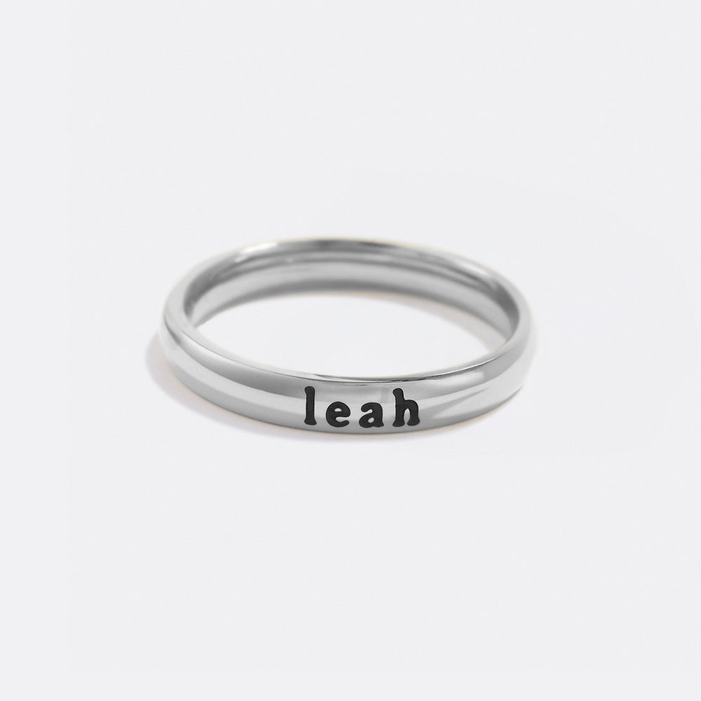 This sleek, minimal ring is perfect for layering or wearing alone, featuring your name, an inspirational word or the name of your loved one in a delicate, modern font.
