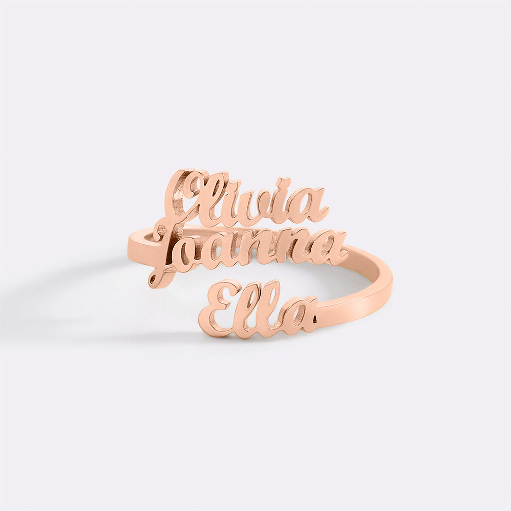 The Triple Name Ring blends sentiment and style effortlessly. Customize it with three names or words, creating a sleek, meaningful piece that’s perfect for celebrating love, family, or your unique story.