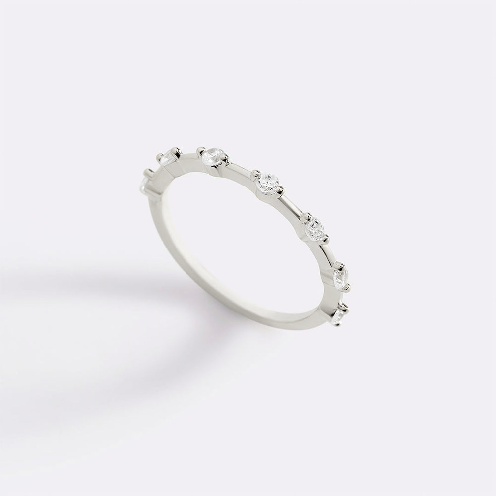 The Ultra Thin Floating Eternity Band redefines minimal elegance. Its delicate design and shimmering accents create a barely-there brilliance, perfect for stacking or wearing solo for a timeless, effortless look.